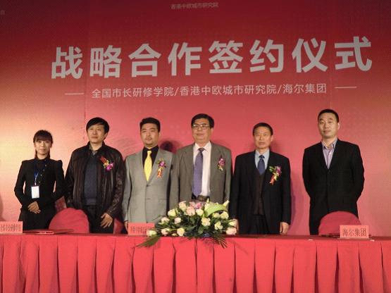 2012年4月18日,我院与香港中欧城市研究院、海尔集团在青岛海尔仰口国际培训中心共同举行了战略合作签约仪式。三方将在青岛设立全国市长研修教学基地,搭建城市建设专家、全国市长、海尔以及从事环保节能智慧城市建设开发的相关单位之间的交流、学习平台。同时,三方探讨了关于共同推进青岛中欧市长论坛及中欧市长论坛大厦的项目建设的可行性。