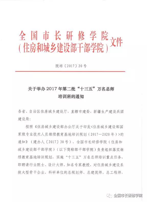 按照《住房城乡建设部办公厅关于印发<住房城乡建设部国家级专业技术人员继续教育基地培训规划(2017—2020年)>的通知》(建办人〔2017〕30号)要求, 全国市长研修学院(住房和城乡建设部干部学院)(以下简称部干部学院)正式开始实施“十三五”万名总师培训计划,即聘请行业院士、设计大师、知名专家教授,对住房城乡建设系统大型骨干企业、科研单位的总规划师、总建筑师、总工程师,开展以新技术、新标准、新政策、新法规、新理论、新方法为重点内容的集中面授培训,免收培训费,使行业高层次骨干专业技术人员及时实现知识更新。