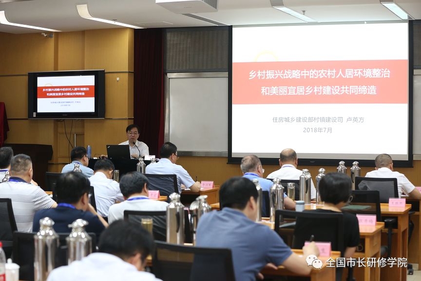 开班式后,卢英方巡视员围绕“乡村振兴战略中的农村人居环境整治和美丽宜居乡村建设共同缔造”进行了政策解读。来自各省、自治区住房城乡建设厅,直辖市建委及有关部门副厅长(副主任、副局长),副省级城市、省会城市住房城乡建设部门负责人,共47人参加了培训。主要学习乡村振兴战略,农村人居环境整治理念及管理经验、工作方法,村镇规划编制,美丽乡村规划建设管理经验和做法,小城镇环境综合整治,特色小城镇建设,农村生活垃圾治理,污水处理技术、设施建设及运营,厕所革命,农村危房改造,传统村落和传统建筑?;し⒄瓜喙卣?、制度、技术等。国家部委领导、国内知名专家为学员们开展座谈交流、政策解读或专题讲座,有关部门同志交流乡村振兴与乡村建设的江苏实践、特色小城镇建设的浙江经验。同时,学员们将赴浙江省绍兴市开展现场教学。