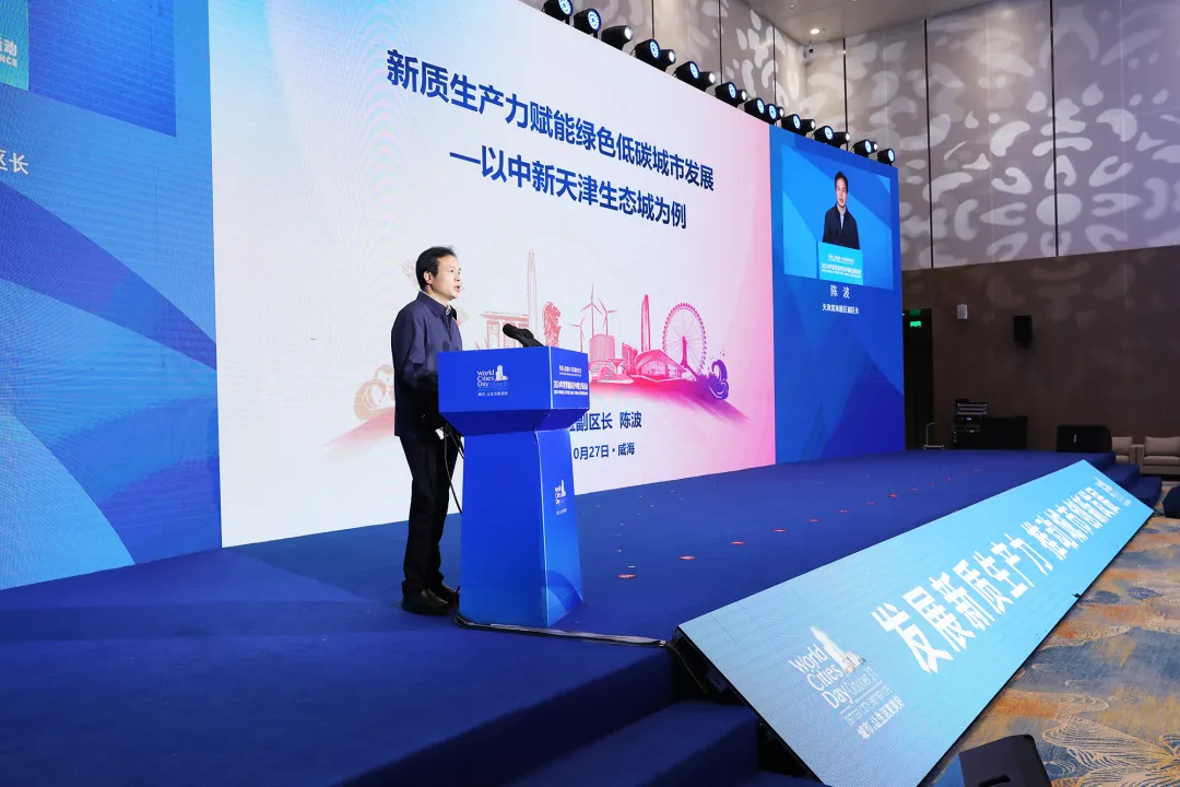 天津市滨海新区副区长陈波以“新质生产力赋能绿色低碳城市发展——以中新天津生态城为例”为题作交流发言。在发言中表示,习近平总书记视察天津,提出“四个善作善成”的重要要求,希望天津在发展新质生产力和提升城市治理现代化水平上勇争先、善作为。滨海新区牢记殷殷嘱托,正在全力建设生态、智慧、港产城融合的宜居宜业宜游宜乐的美丽“滨城”。滨海新区以中新天津生态城为示范引领带动全区,用新质生产力促进城市功能、品质、业态提升,高质量打造宜居、韧性、智慧城市。