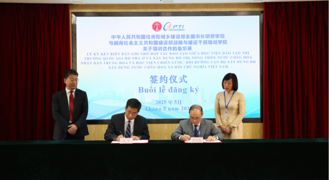 经批准,培训班举办期间,学院与越南建设部战略与建设干部培训学院签署《中华人民共和国住房和城乡建设部全国市长研修学院与越南社会主义共和国建设部-战略与建设干部培训学院关于培训合作的备忘录》。在学院党委书记全河、越南河内市内务厅首席监察官武氏玉燕(Vo Thi Ngoc Yen)的共同见证下,学院副院长王军与越南建设部战略与建设干部培训学院副院长范文部(Pham Van Bo)代表双方签署,学院市长研修部主任刘悦主持签署仪式。