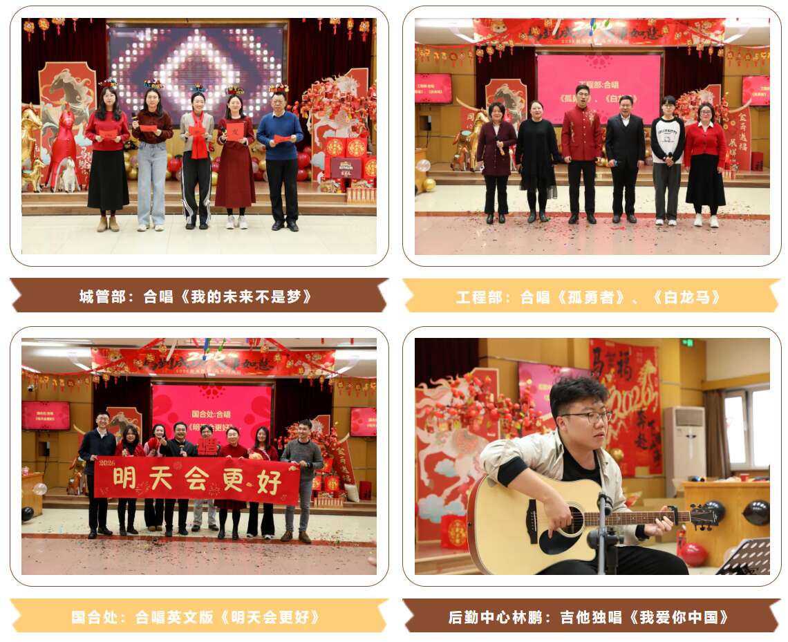 歌曲类节目中,城市管理执法培训部率先登场,一曲《我的未来不是梦》以激昂的旋律唱出对梦想的执着与对未来的笃定。工程建设培训部带来歌曲串烧,将《孤勇者》的坚韧与《白龙马》的情怀巧妙融合,台下掌声不断。国际合作处(世界城市日办公室)随后登台,以一首温暖治愈的英文版《明天会更好》传递对学院发展的美好祝愿,歌声如春风拂面,让每个人心中充满前行的力量。后勤服务中心林鹏的吉他独唱《我爱你中国》,悠扬的旋律、深情的演绎,将对祖国深沉的爱恋娓娓道来。