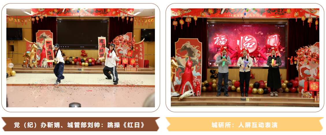 动感十足的跳操《红日》由党委办公室(纪委办公室)靳娟与城市管理执法培训部刘帅联袂呈现,铿锵的节奏、利落的动作,将干事创业的热血与新春奋进的精气神展现得淋漓尽致,台下不少同事也忍不住跟着节奏摇摆,现场变成一片欢乐的海洋。城市发展研究所(市长智库办公室)的创新表演《人屏互动——金鼓送福启新程》成为一大亮点,炫酷的屏幕动画与演员默契配合,金鼓敲响新春福气,科技感拉满的视觉盛宴不仅送出了满满福气,更奏响了学院砥砺奋进、再启新程的昂扬序曲。