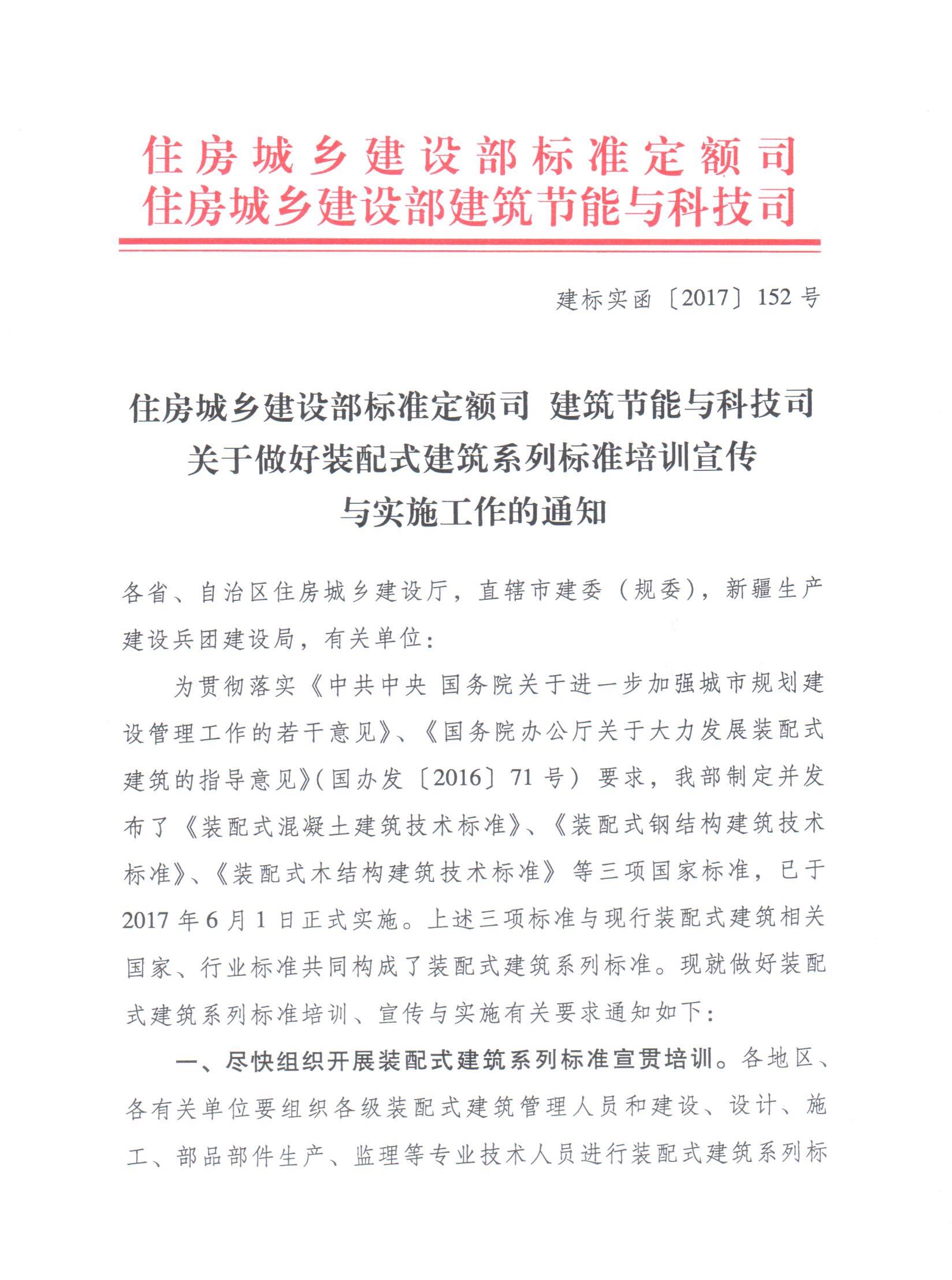 为贯彻落实《中共中央国务院关于进一步加强城市规划建设管理工作的若干意见》、《国务院办公厅关于大力发展装配式建筑的指导意见(国办发〔2016〕71号)要求,我部制定并发布了《装配式混凝土建筑技术标准》、《装配式钢结构建筑技术标准》、《装配式木结构建筑技术标准》等三项国家标准,已于2017年6月1日正式实施。上述三项标准与现行装配式建筑相关国家、行业标准共同构成了装配式建筑系列标准。现就做好装配式建筑系列标准培训、宣传与实施有关要求通知如下: