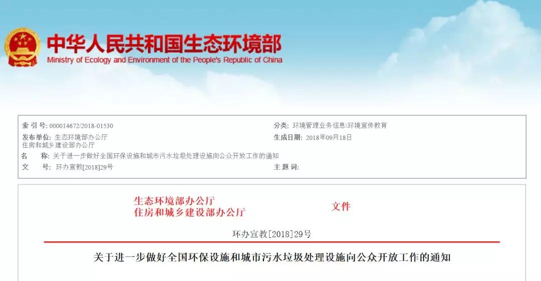 日前,生态环境部、住房城乡建设部联合印发《关于进一步做好全国环保设施和城市污水垃圾处理设施向公众开放工作的通知》,要求2020年年底前,全国所有地级及以上城市选择至少1座环境监测设施、1座城市污水处理设施、1座垃圾处理设施、1座危险废物集中处置或废弃电器电子产品处理设施向公众开放,鼓励地级及以上城市有条件开放的4类设施全部开放。