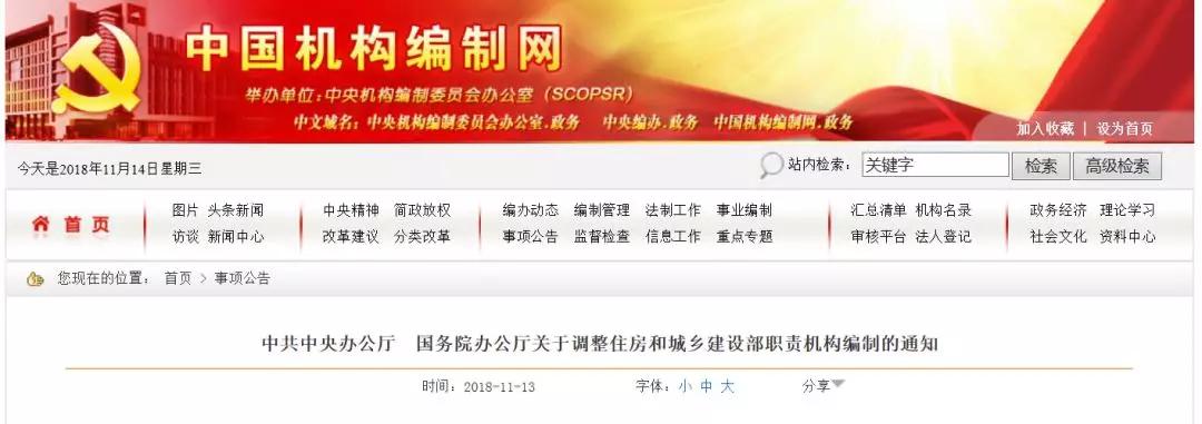 根据党的十九届三中全会审议通过的《深化党和国家机构改革方案》和第十三届全国人民代表大会第一次会议批准的《国务院机构改革方案》,经报党中央和国务院批准,现就住房和城乡建设部职责、机构和编制调整情况通知如下。