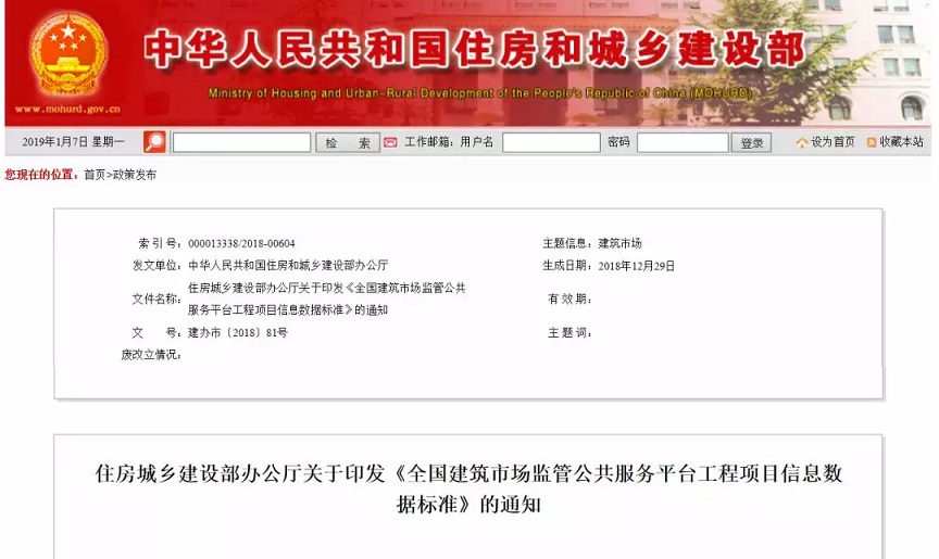 近日,住房城乡建设部办公厅印发要求关于《全国建筑市场监管公共服务平台工程项目信息数据标准》的通知,要求各地主管部门明确专人负责新数据标准实施工作,确保在2019年6月底前完成本地区省级建筑市场监管一体化工作平台工程项目数据库升级工作。