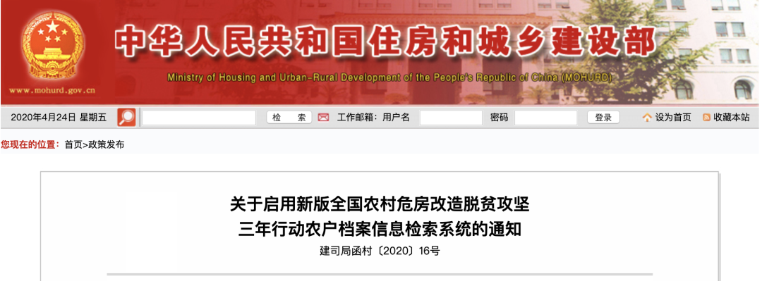 近日,住房和城乡建设部村镇建设司印发了关于启用新版全国农村危房改造脱贫攻坚三年行动农户档案信息检索系统的通知。