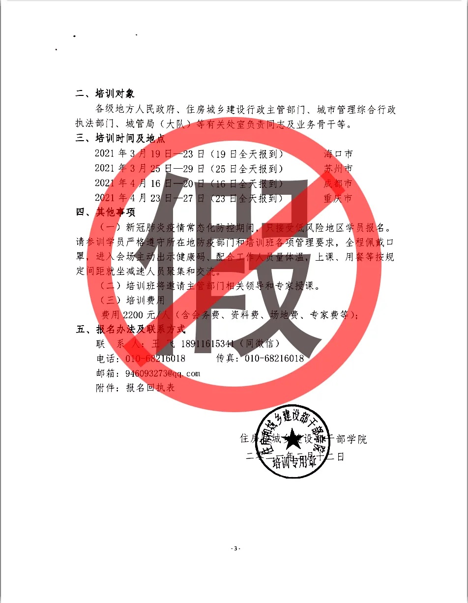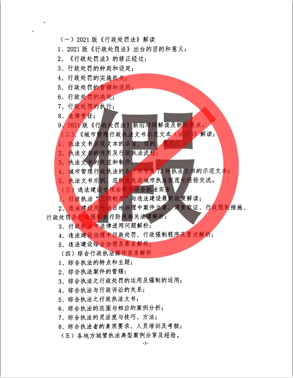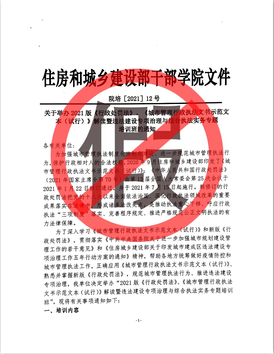 一、我院从未下发过“关于举办2021版《行政处罚法》、《城市管理行政执法文书示范文本(试行)》解读暨违法建设专项治理与综合执法实务专题培训班的通知(院培[2021]12号)”,通知中所公布的培训内容也并非我院组织,所列明的工作人员非我院员工,联系方式与我院无关。