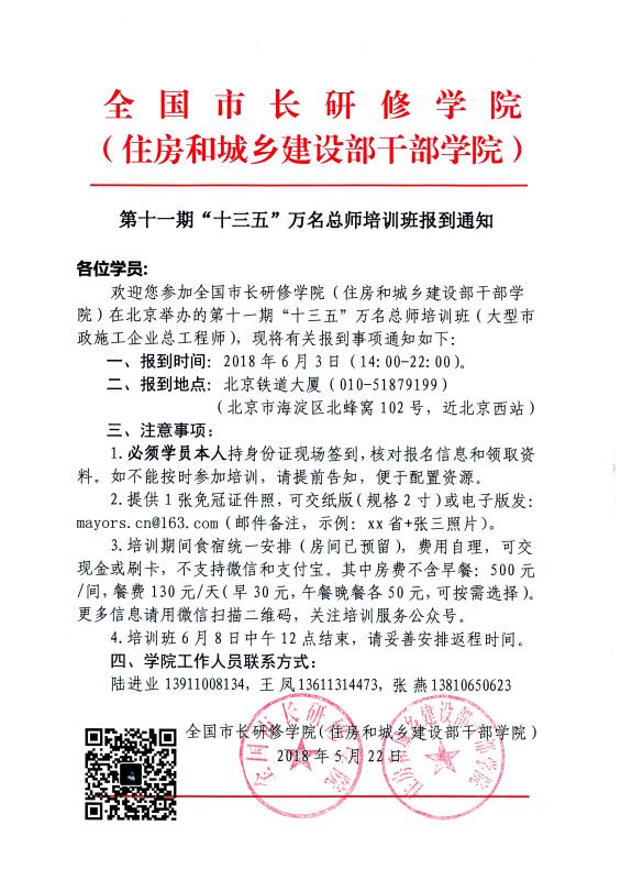 按照全国市长研修学院(住房和城乡建设部干部学院)《关于举办2018年第一批“十三五”万名总师培训班的通知》(院培〔2018〕4号)有关学员推荐条件、方式和工作安排的要求,经省级住房城乡建设主管部门组织推荐报名并汇总后,现将总第十一期“十三五”万名总师培训班学员名单,在住房城乡建设部国家级专业技术人员继续教育基地,即全国市长研修学院(住房和城乡建设部干部学院)网站进行公示,公示时间自2018年5月24日至6月3日。在此期间如有异议,请以书面形式向我院反映。